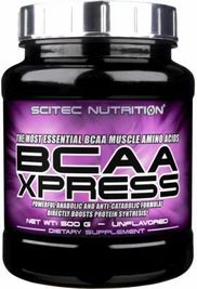 Scitec Nutrition – BCAA Xpress. По большинству параметров, продукт очень похож на «BCAA-PRO 5000 от SAN». Концентрация у них чуть меньше – 71%, но в банке и на 10 граммов общего веса больше. В пересчете у «BCAA-PRO 5000 (690гр)» и у «BCAA Xpress (700гр)» количество самих ВСАА получается по 500гр. Но только BCAA Xpress немного дешевле. Ведь, на мой взгляд, «Scitec Nutrition» не является брендом такого статуса, как SAN. Но, по крайней мере, у «BCAA Xpress» в репертуаре есть два вкуса: яблоко и лимонад. Так же, имеется без вкусовой вариант выпуска, который весит «500гр».