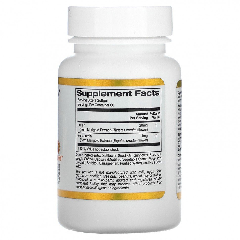 Лютеин с зеаксантином California Gold Nutrition – источник одноименных питательных веществ, которые усиливают антиоксидантную защиту организма, помогают поддерживать здоровье зрительной системы. В качестве натурального сырья используются цветки бархатцев вида Tagetes.