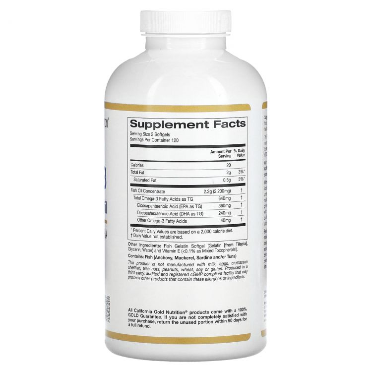 Рыбий жир омега-3 премиального качества от California Gold Nutrition® — это сверхкритический экстракт, который содержит 180 мг ЭПК и 120 мг ДГК в одной капсуле и получен путем молекулярной дистилляции высокоочищенного и концентрированного натурального рыбьего жира от мировых производителей в соответствии со строгими стандартами качества. Капсулы из рыбьего желатина не содержат свиных или бычьих ингредиентов и производятся в Калифорнии, США из сырья от мировых производителей