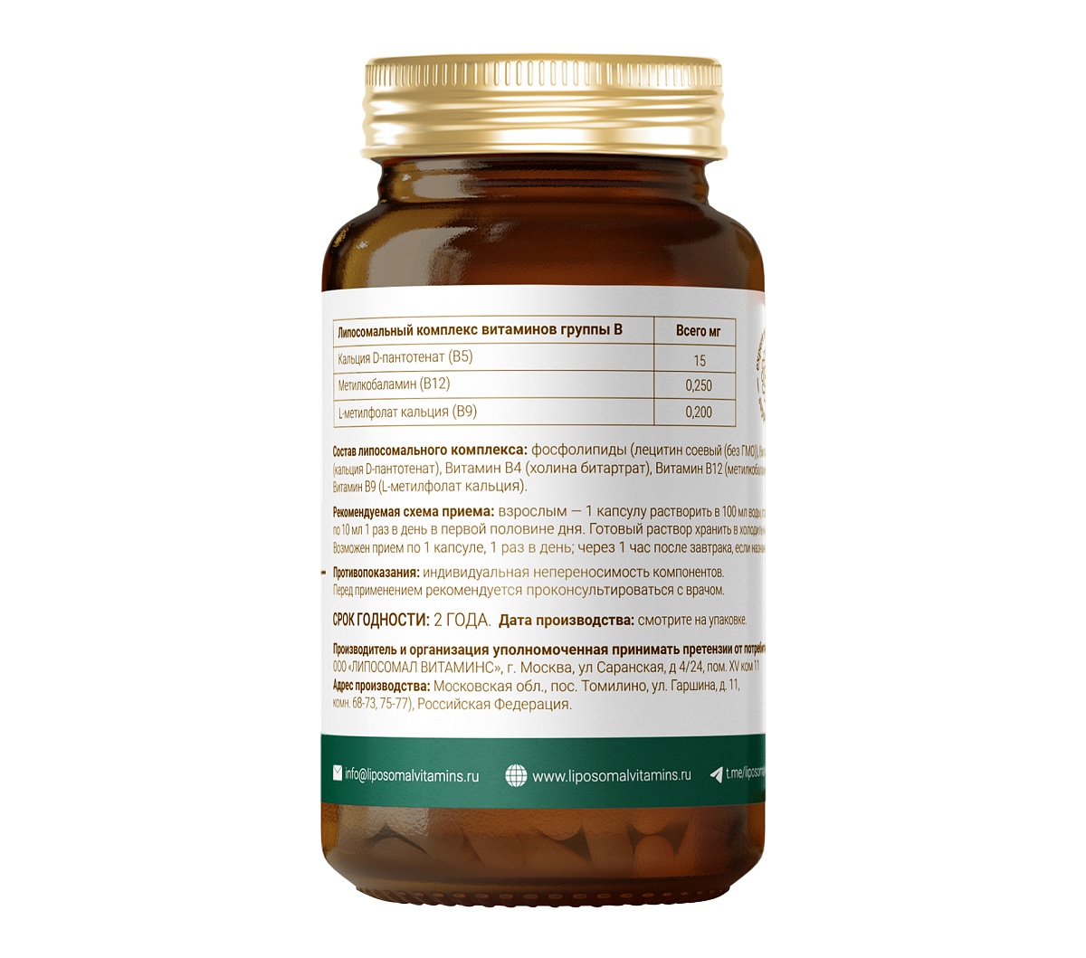 Другие ингредиенты: натуральный соевый лецитин (не ГМО), кальция D-пантотенат (B5), холина битартрат (B4), метилкобаламин (B12), L-метилфолат кальция (B9).
