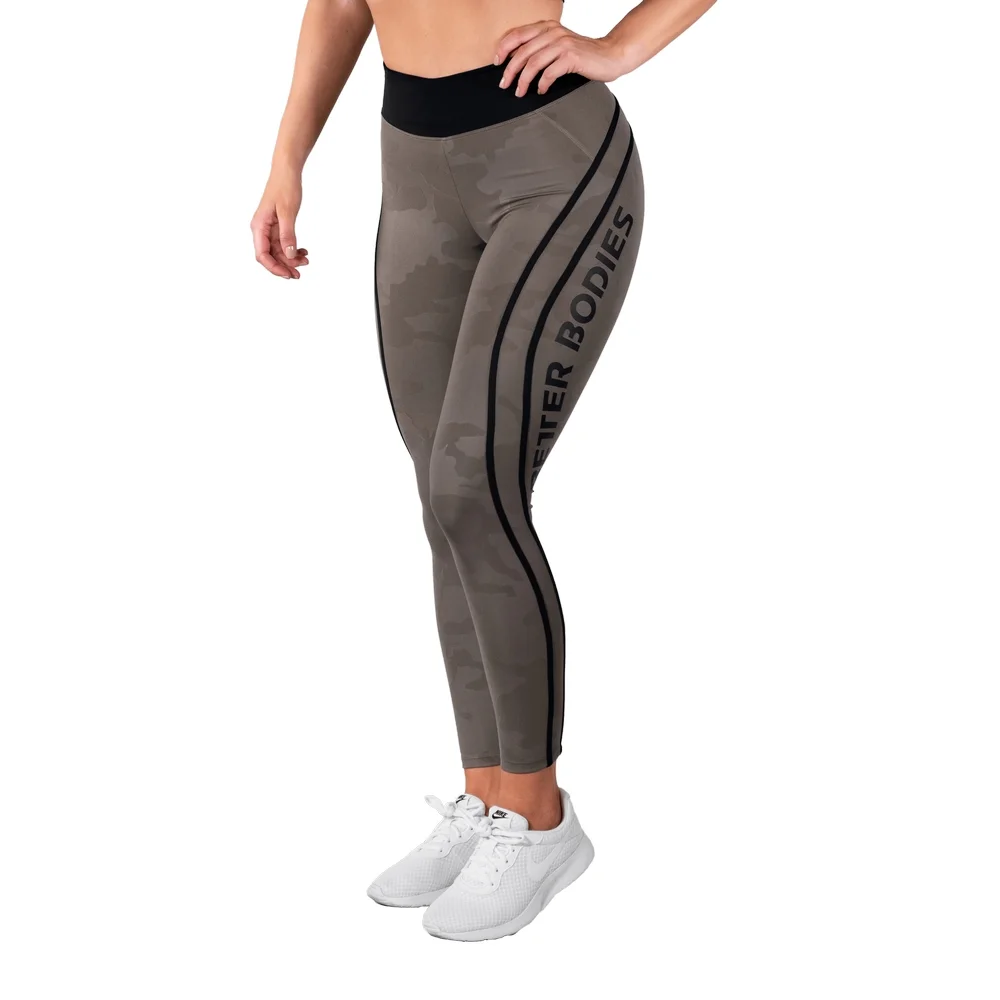 Лосины с высокой талией Better Bodies Camo High Tights изготовлены из компрессионной ткани. Небольшой кармашек на поясе для небольших предметов. По бокам контрастные линии.