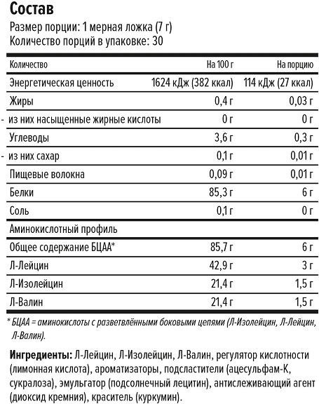 BCAA Powder – это мощная формула, содержащая аминокислоты с разветвленными цепями (BCAA) в классическом соотношении 2:1:1 (L-Лейцин, L-Изолейцин, L-Валин). BCAA – основной материал для построения мышц. Прием BCAA необходим любому атлету, так как они играют важную роль в увеличении мышечной массы, в восполнении энергетических запасов, способствуют сжиганию жира и защите мышц от разрушения.