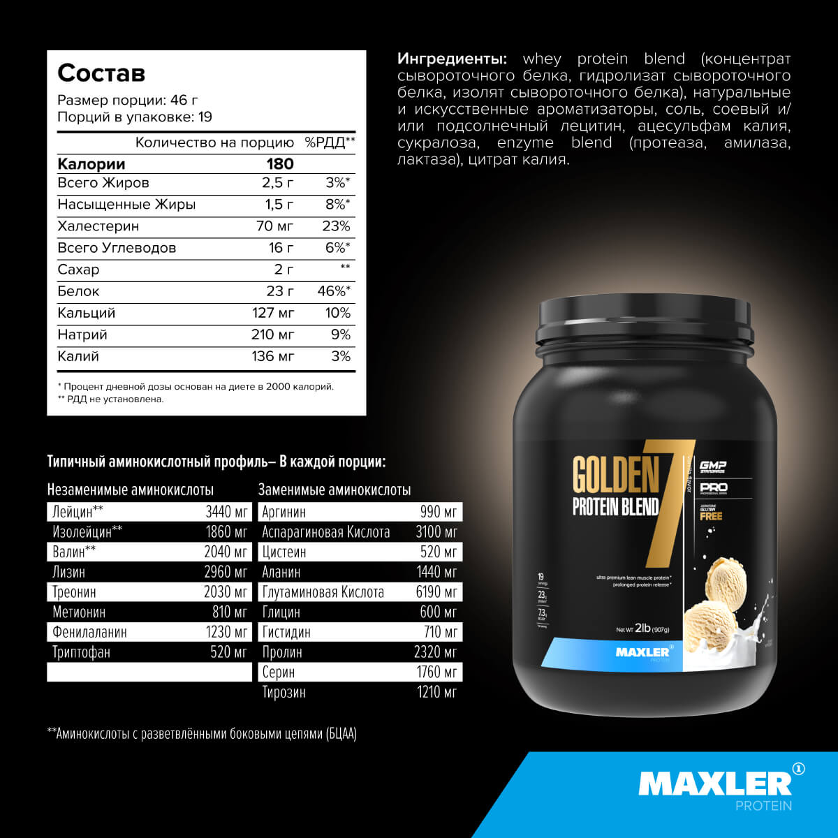 В Maxler Golden 7 Protein Blend разработан с учетом этих различий мы объединили несколько источников белка, чтобы обеспечить ваш организм оптимальным количеством макроэлементов. Гидролизованные сывороточные белки помогают аминокислотам быстро усваиваться, тогда как смесь казеина питает организм на протяжении нескольких часов после приема протеина.