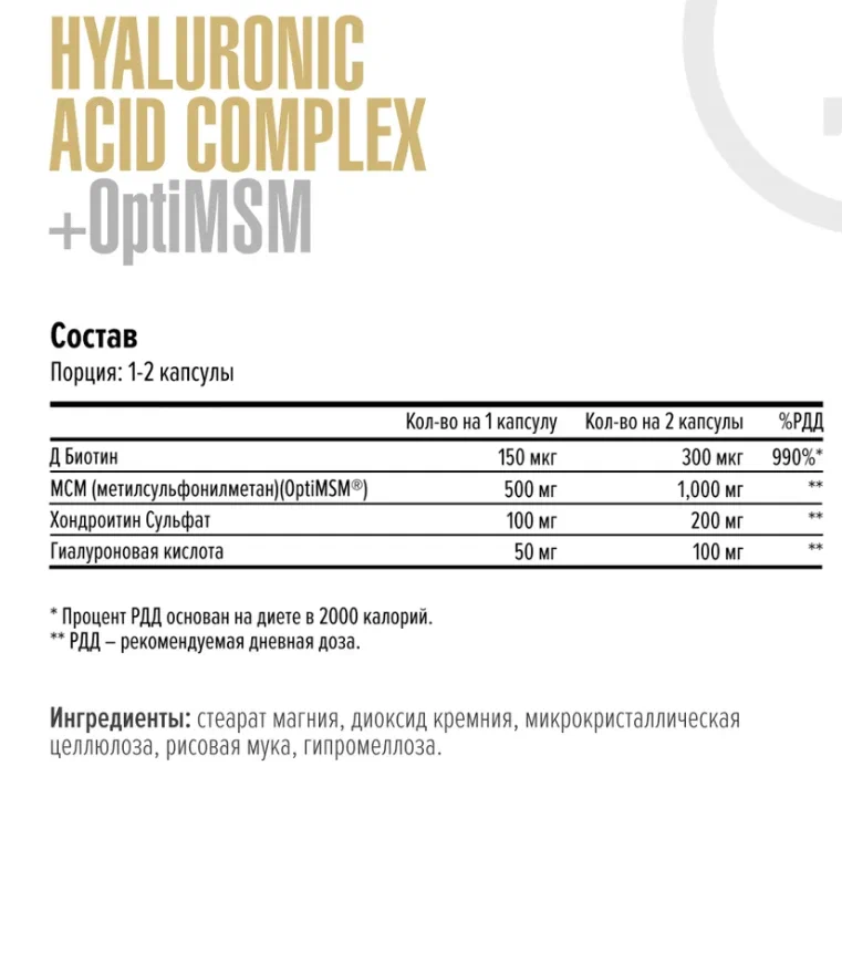 Maxler Hyaluronic Acid Complex + OptiMSM — это формула, созданная для поддержания красоты внутри и снаружи. Эта добавка не содержит глютена и молочных продуктов и является простым способом обеспечить свой организм ингредиентами, необходимыми для борьбы со старением и безупречного внешнего вида.