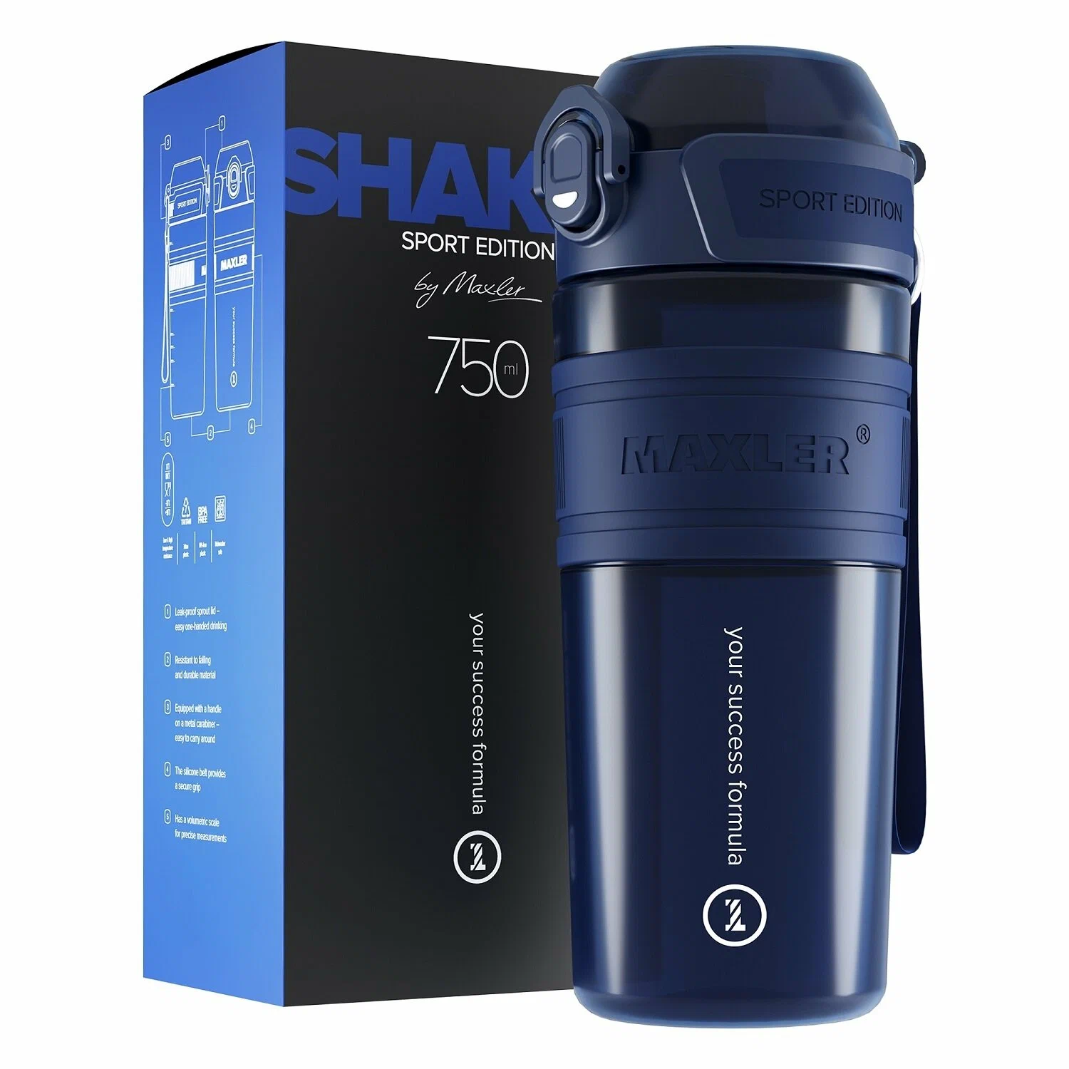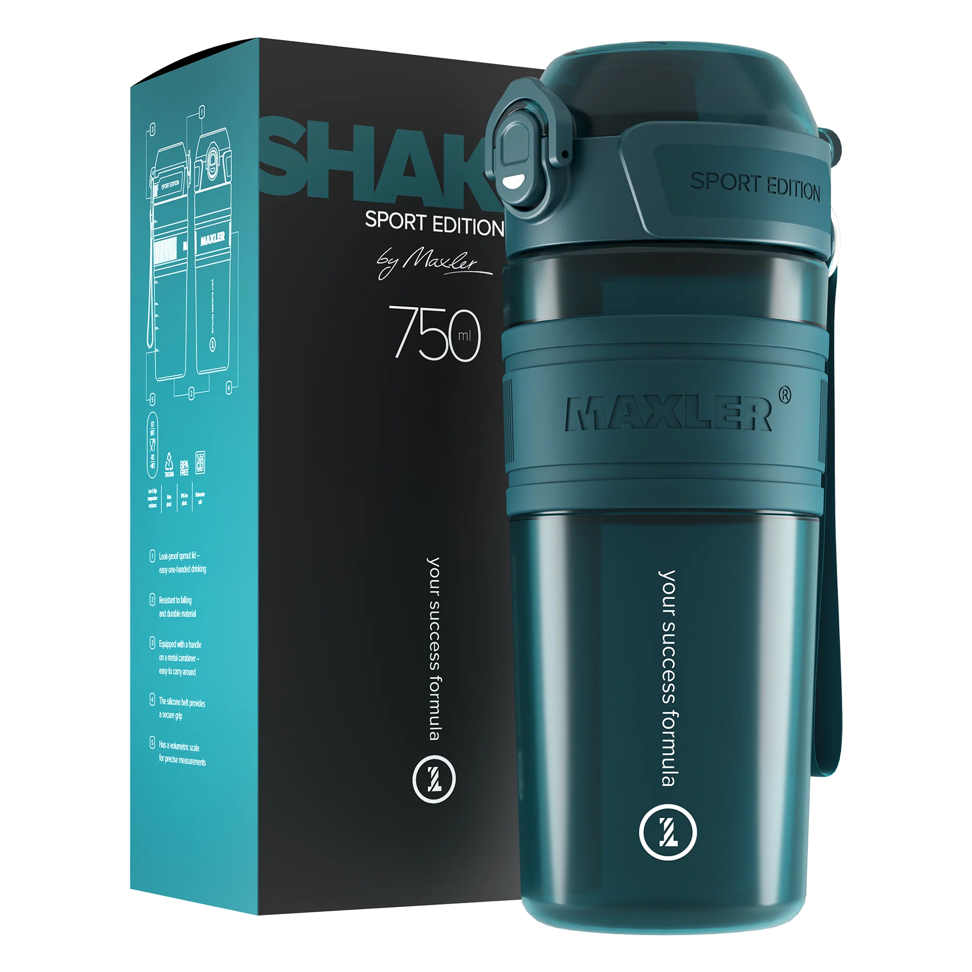 Съёмный ремешок и карабин позволяют носить шейкер на руке, закреплять на рюкзаке или подвешивать в спортзале.