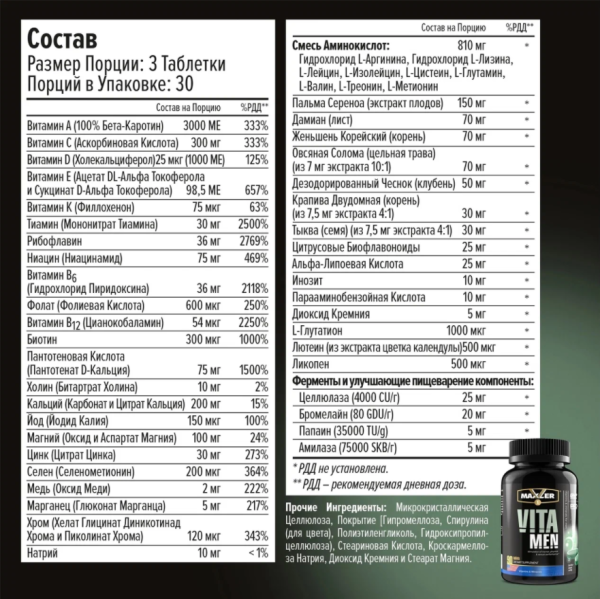 Другие ингредиенты: микрокристаллическая целлюлоза, покрытие (гипромеллоза, спирулина водоросли, гидроксипропилцеллюлоза, полиэтиленгликоль), стеариновая кислота, кроскармеллоза натрия, диоксид кремния, стеарат магния