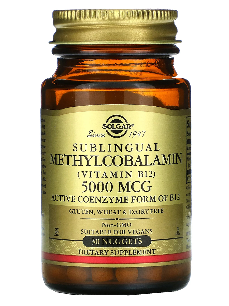 Метилкобаламин – витамин В12 Солгар 5000 мкг – однокомпонентный препарат, содержащий активную коэнзимную, легко усвояемую форму витамина B12. Действующее вещество способствует профилактике анемии, активизации процесса энергетического синтеза, нормализации работы нервной системы.
