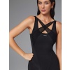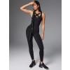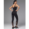 Черный комбинезон прилегающего силуэта с перекрестием на груди. Фактурные линии моделируют фигуру и округляют бедра, делая тело визуально стройнее. Эластичная сетка в цвет комбинезона усложняет модель. Вставки на ногах и груди сочетаются между собой и создают стильный акцент.