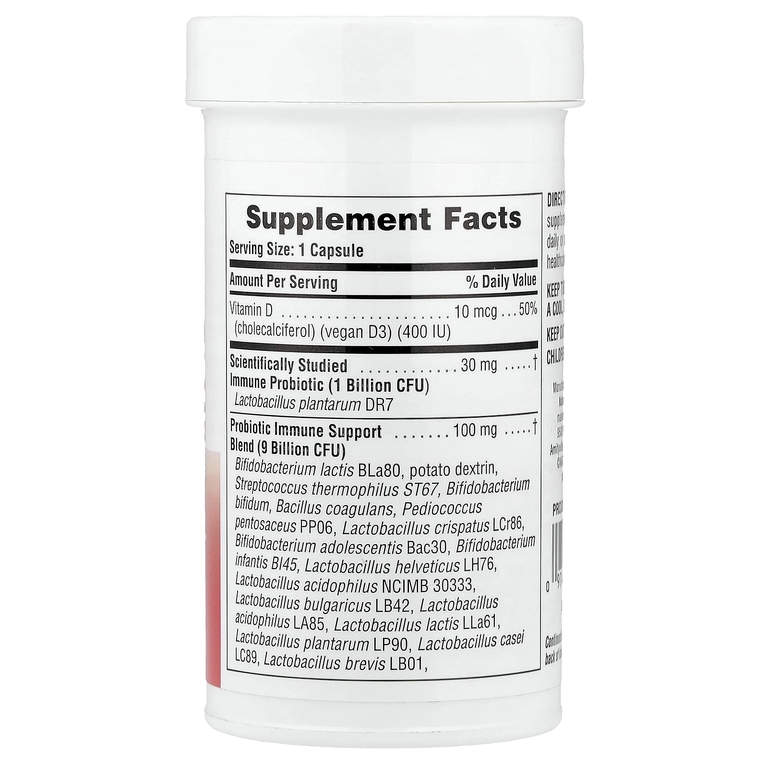 Каждая капсула длительного хранения, эффективная добавка, содержит 10 миллиардов живых поддерживающих иммунитет пробиотических бактерий из 19 штаммов, включая научно изученный штамм DR7 лактобактерий плантарум (Lactobacillus plantarum), который, как было доказано, способствует здоровью иммунной, респираторной систем и здоровья желудочно-кишечного тракта.