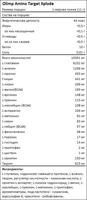 Ингредиенты: L-глутамин, гидролизат говяжьего протеина, L-аланин, таурин, регулятор кислотности лимонная кислота; L-орнитин-L-аспартат, L-лизина гидрохлорид, L-валин, L-изолейцин, L-треонин, L-метионин, L-триптофан, ароматизаторы, подсластитель сукралоза, ацесульфам K; краситель рибофлавин.