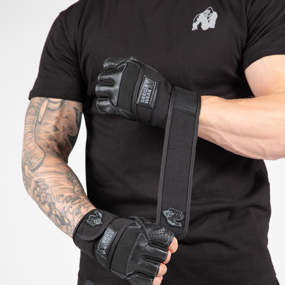 Кожаные перчатки для занятий фитнесом с обмоткой. Крепко обхватывают запястье и защищают лучезапястные суставы вместе с расположенными в той же области связками. Если даже спортсмен будет работать с большим весом, перчатки для фитнеса снизят риски растяжения и разрыва сухожилий.