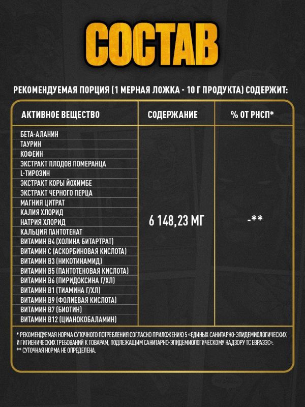 Reckful Gold включает в себя мощную смесь активных ингредиентов: кофеин для повышения энергетического уровня, таурин для катализации действия стимуляторов, бета-аланин для облегчения усталости мышц после тренировки, и L-Тирозин для улучшения концентрации и ускорения метаболизма. Дополнительно добавлены витамины C и В, а также минералы кальций, натрий, калий и магний, способствующие поддержанию нервно-мышечной возбудимости и энергетического потенциала клетки.