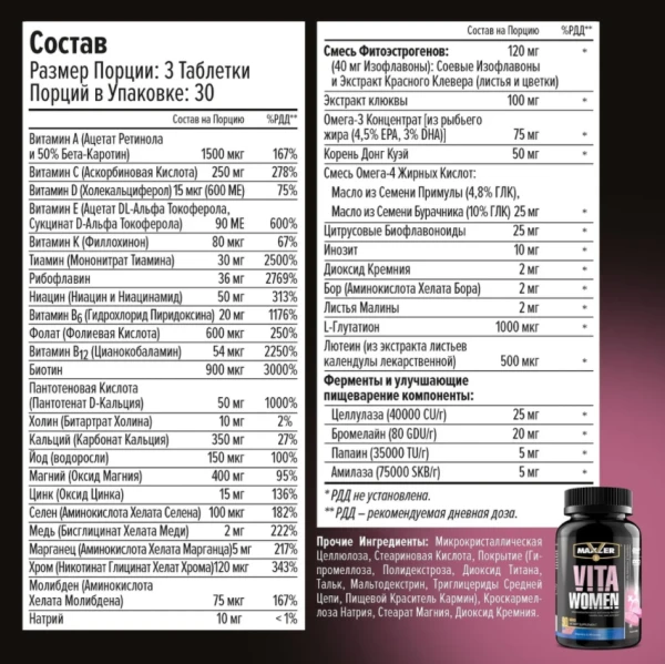 Комплекс витаминов Vita Women создан для женщин всех возрастов, ведущих активный образ жизни. Ингредиенты продукта стимулируют защитные функции организма, укрепляют структуру волос и ногтей, нормализуют пищеварительную систему, уменьшают негативные последствия стресса, улучшают функцию мозга и наполняют тело энергией. Vita Women – это комплекс ключевых витаминов, которые работают так же активно, как и вы!